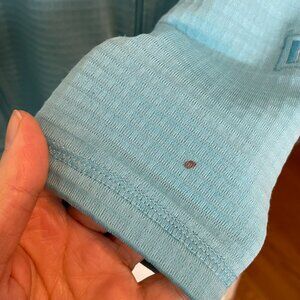 Pre-owned. There is a small spot on the sleeve. There is a spot of discoloration on the front (only visible under bright light and might come out with laundering.) There is a small "pull" on the front. A small hole has been stitched up on the back. View all images for condition.