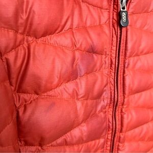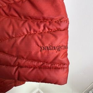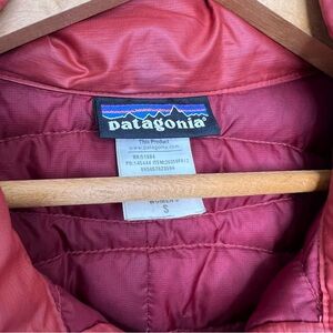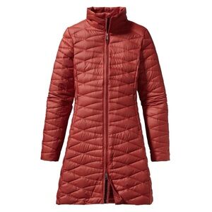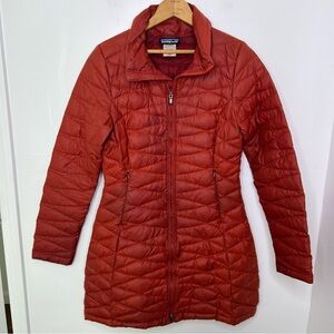 Patagonia Red Fiona Long Puffer Coat. Good Condition but there are a couple discolorations and stains shown in the photos. Size Small