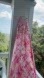 This beautiful dress has a fluttery fabric layer at the bodice, a built-in shelf bra, woven straps in the back and deep side slits for mobility.