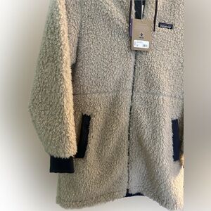 Cozy cream fleece jacket with navy accents. Features a hood and front pockets, NWT!