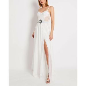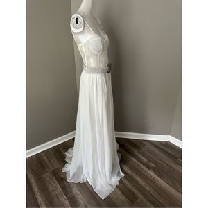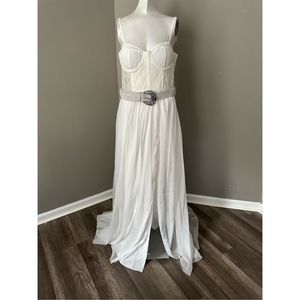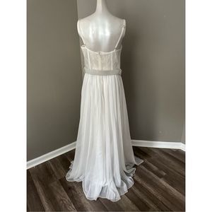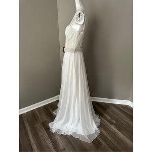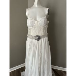 This bustier dress features a lace-paneled bodice with underwire support and a full skirt with a removable belt.