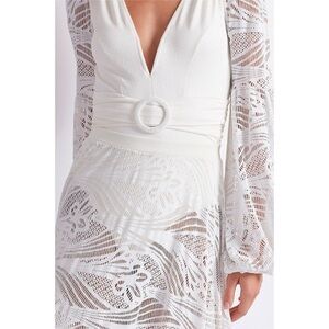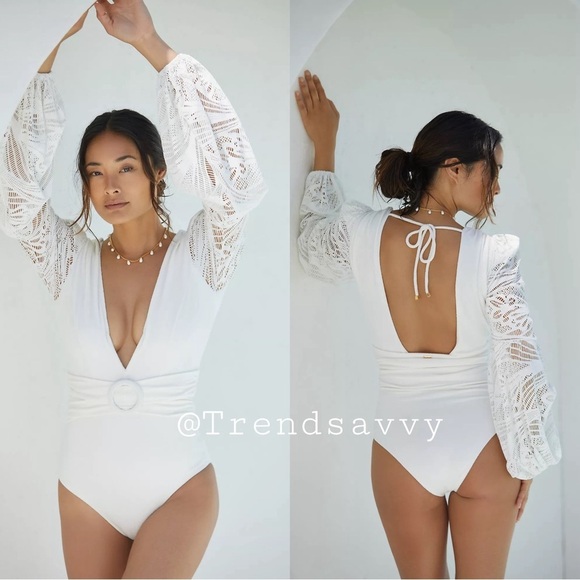 PATBO METALLIC LACE PLUNGE LONG SLEEVE ONEPIECE SWIMSUIT / BODYSUIT WHITE S NWT