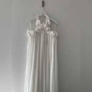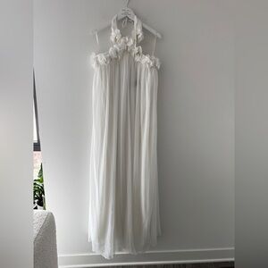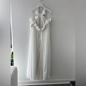 Flowy layers of chiffon create an airy appeal, while hand-embroidered floral embellishments across the halter neckline make this maxi fit for any garden party.