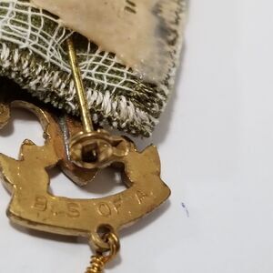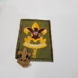 This is a vintage set of Boy Scouts of America patch and pins, featuring the motto "BE PREPARED." The item is not signed and is intended for sale as a single unit. It is associated with the Boy Scouts organization and may appeal to collectors of historical memorabilia and fraternal organizations. 2.830