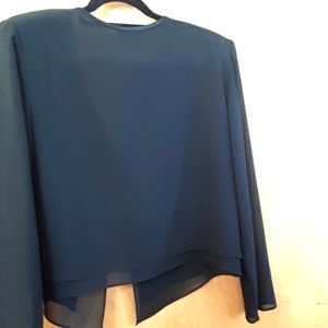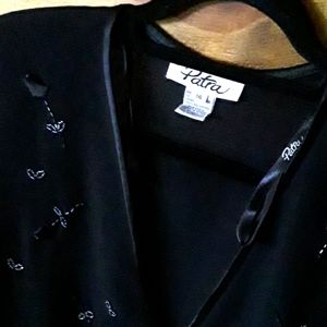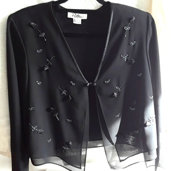 Very elegant PATRA black double lined blouse with sheer black long sleeves. Embossed chrome and black designs are of long stem roses and leaves. Has shoulder pads to enhance your hour glass shape. Blouse is in excellent condition. Has been steamed cleaned and sanitized. Ready to wear.