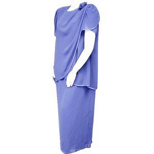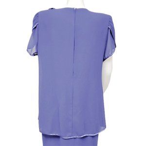 Lovely violet colored Chiffon special occasion/MOB maxi-dress. Features short, tulip style sleeves, back zipper entry, and jewel neckline. Single dress designed as two-piece, embellished with oversized fabric rosette. 100% Polyester. Dry clean. Made in the USA.