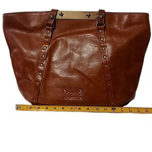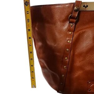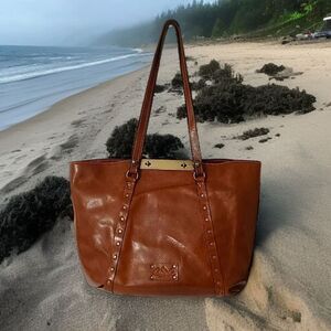 PATRICIA NASH Benvenuto Tote Leather Suede Heritage Tan Brass Accents Bohemian. Condition is pre-owned with no rips, tears or holes. Has some very minor wear marks to a couple corners, and a couple minor scuff marks. Otherwise GORGEOUS condition Measures ABOUT 16" X 12" X 6". Suede inside, and leather outside. This is a large bag. Please see all photos for detailed condition.