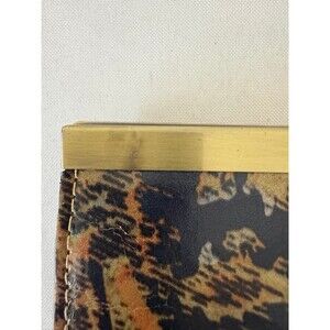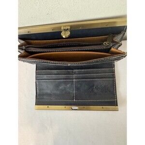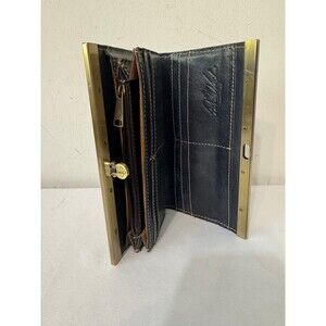 You know the brand, wonderfully made Patricia Nash top frame wallet in distressed shades of black, browns and gold, and a little blue. Brass hardware. Push lock closure. There are a few minor scratches on the brass. I believe it's from storage. Inside is pristine.