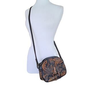 This Patricia Nash Chania Crossbody Bag comes in a lovely Fall Tapestry Print in navy blue and orange Vintage Italian Leather