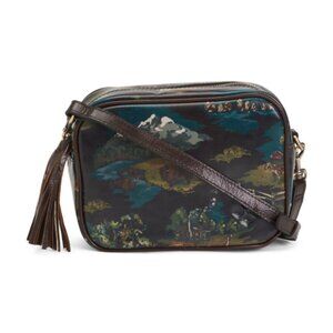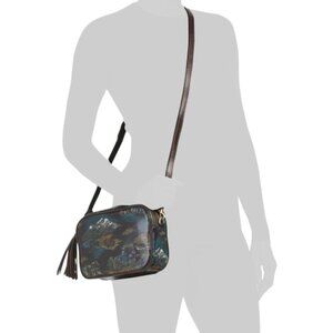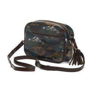 printed design, detachable adjustable crossbody strap, tassel zipper pull