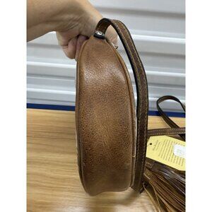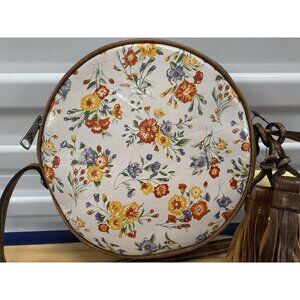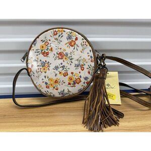 DescriptionThis is a new with tags Patricia Nash Mini Meadows floral print round leather crossbody bag purse with long double tassel cognac leather accents and original dust bag. Features cream base with pretty oranges, yellows and denim blues floral pattern on front and back, distressed cognac leather sides, adjustable cross body strap, and long double tassel bag charm, outer magnetic snap slip pocket, zippered top, soft velvety brown interior lining with 3 wall pockets (1 zippered and 2 slip). Measures approx: 21 - 26" strap drop (adjustable); 8.5" wide (side to side) x 8.5" high x 2" deep. Wonderful styling and quality! Item is stored and ships from a smoke free location.