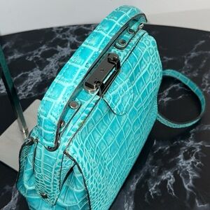 NOTE: THIS IS AN AUTHENTIC BAG. Never worn. The Latch closure is broken. The way to close/open the bag is only by the leather pull. Please refer to last photo.