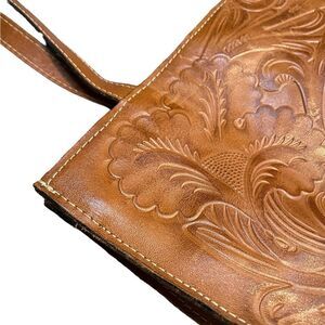 Exterior: slip pocket on rear, double handles, burned edge finish, deep embossed logo