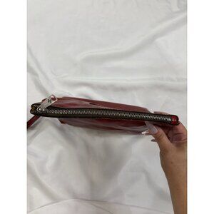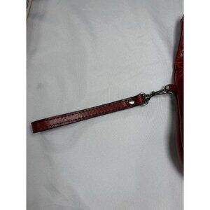 The PATRICIA NASH Valerie Ruby Red Leather Wristlet Clutch Purse is a small rectangular handbag made of leather with a distressed finish. It features a zip closure and a stylish red wrist strap accent. The interior is lined with faux suede and has a solid red color with bronze hardware. This designer purse is perfect for travel and has a unique designer theme, making it a fashionable and functional accessory for any woman's wardrobe. The handcrafted leather material and stylish design make it a versatile piece that can be used for various occasions. Excellent clean condition