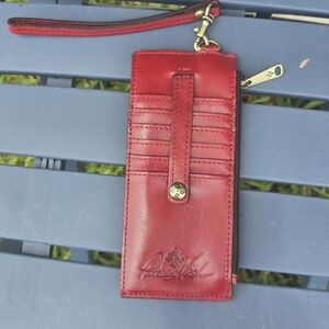 Stylish red leather wristlet wallet with multiple card slots and a zippered pocket. Perfect for on-the-go convenience.
