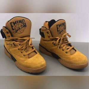 These classic Ewing 33 HI sneakers are a sunflower and black color with “33” on the back of the shoe. The upper material is a leather suede with nylon on the back, and rubber soles. Black strap on the back, which is adjustable. They are in perfect condition, no blemishes.