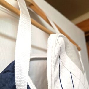 This backpack showcases a striking white and blue pinstripe design, reminiscent of classic baseball aesthetics. Crafted from durable fabric, it combines style and functionality for everyday use. The navy blue accents enhance its sporty appeal, making it a standout choice for any occasion.
