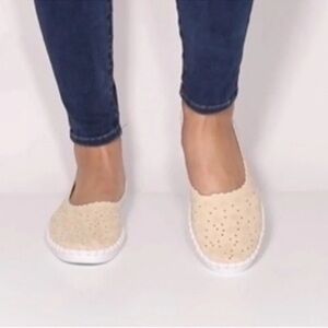Trendy ballerina featuring a beautiful floral laser etching and cutout design and dainty scalloped edge topline all on a stitched to sole construction, comfort flat with a removable insole.
