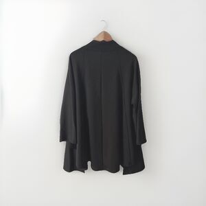 Layered swing jacket, trench coat styling with asymmetrical lapels. Zip front, zip side pockets.