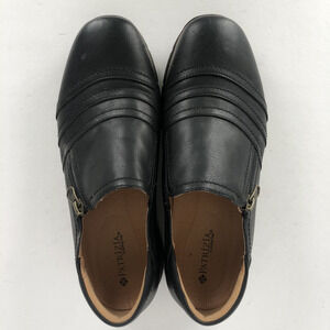 These PATRIZIA by Spring Step slip-on/zip shoes are a stylish and comfortable option for women in size 41 (US 9.5-10). Made of black leather, these flat shoes feature a round toe and a rubber outsole for added durability. Designed for casual occasions, they offer both style and comfort with a leather lining and insole. Perfect for everyday wear, these high-quality shoes from Spring Step are a versatile find.