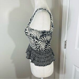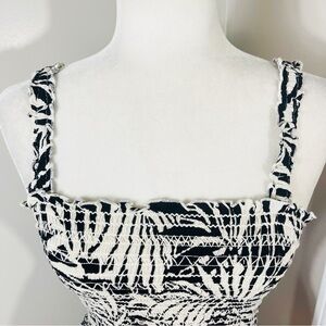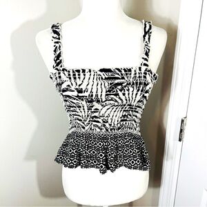 PATRONS OF PEACE Black & White Tropical Smocked Ruffled Peplum Crop Tank - SMALL