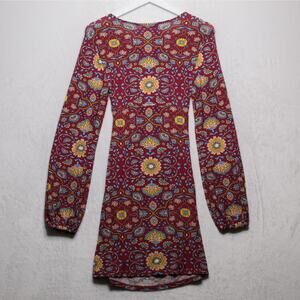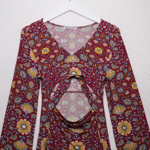 PATRONS OF PEACE Cut Out Paisley Floral Bohemian Mini Dress Stretch Jersey Retro