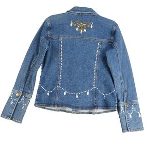 Stylish denim jacket with intricate embroidery. Features gold accents and button closure. Elevate your casual wardrobe with the Patti La Belle Country Denim Jacket, a must-have for those who appreciate a blend of comfort and style. Embellished with eye-catching rhinestone beads, this blue denim jacket offers a mid-length cut that pairs effortlessly with your favorite jeans or dress.