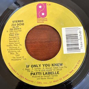 This 7" vinyl record by Patti LaBelle from 1983 includes the hit songs "I'll Never Give Up" and "If Only You Knew". The record features a speed of 45 RPM and is in the format of a single. The record label is Philadelphia International Records, known for its contributions to R&B and Soul music.