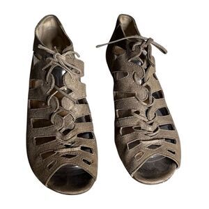 These Paul Green shoes are sort of a dark taupe with a metallic sheen. Featuring peep-toes, a lace-up front, cut-out detailing on the sides and toe, and a wooden block stacked heel. A caged booty with Greek or Egyptian sandal vibes. Made from high-quality leather.