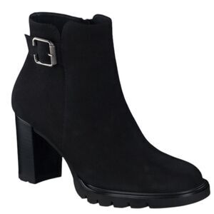 Details: A roller buckle lends a touch of edge to this versatile bootie raised on a chunky sole and block heel and built with a hidden gore inset to perfect the fit.