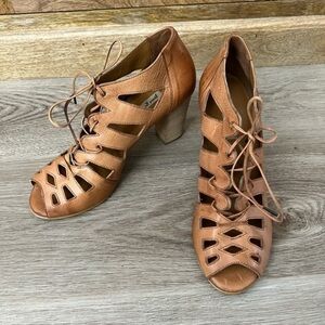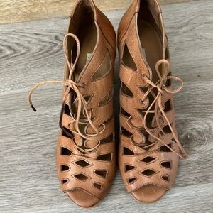 PAUL GREEN cognac color heeled ankle cut out peep toe booties with laces