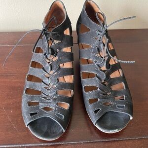 PAUL Green Prague Lace Up Cut Out Peep Toe Block Heel Ankle Bootie Black 7.5