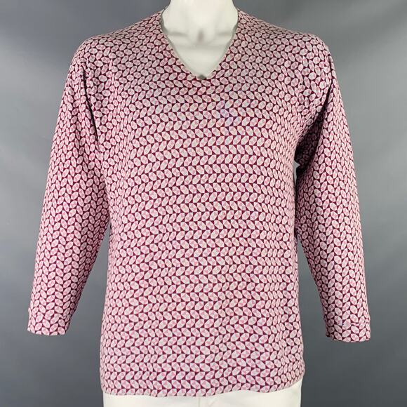 PS by PAUL SMITH pullover in a light blue cotton knit featuring all over multi-color geometric pattern, long sleeves, and V-neck.