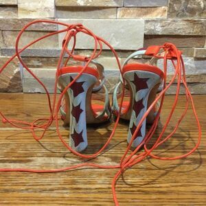 Step out in style with these vibrant red sandals featuring star embellishments. Perfect for adding a pop of color to any outfit. Good condition.