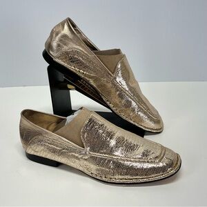 PAULA TORRES Gold reptile embossed MADRID square toe loafers size 9
