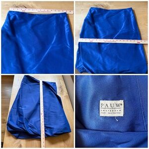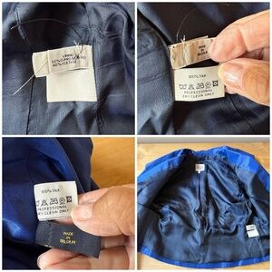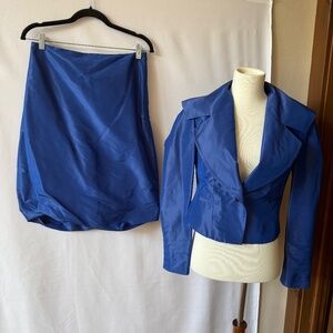 Size 1 - US size 6, 100% silk, fully lined, made in Belgium, royal blue, single button cropped blazer, padded shoulders, skirt has a side zipper, knee length, bubble hem.