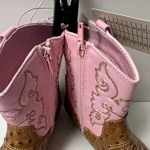 Charming boots with pink upper and brown foot. Heart and swirl details add fun. Ideal for little explorers.