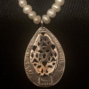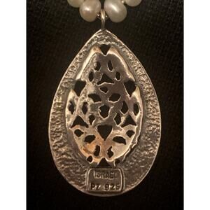 The PAZ Sterling Silver & Freshwater Pearl Hammered & Scrolling Necklace is a stunning piece of fine jewelry crafted in Israel. The teardrop pendant features an open scrolling design in the center with a hammered outer edge, showcasing the beauty of cultured freshwater pearls. The necklace is 18 inches in length and signed by the brand PAZ, adding to its authenticity and value. Perfect for special occasions like engagements, weddings, anniversaries, and birthdays, this necklace is a timeless and elegant choice for those looking for a unique and sophisticated piece of jewelry. Marked PZ, 925 and Israel