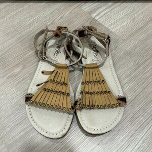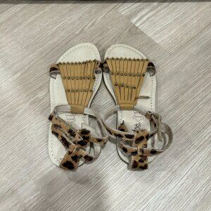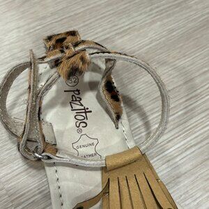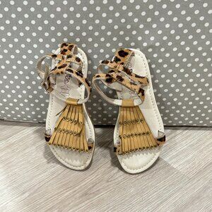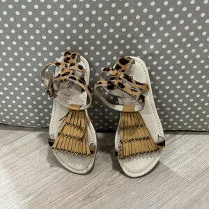 Keywords: Cowhide, leather, genuine leather, kids, kid, little kid, girl, fringe, western, sandal, gladiator, gladiator sandal leopard print, quality, fashion, style