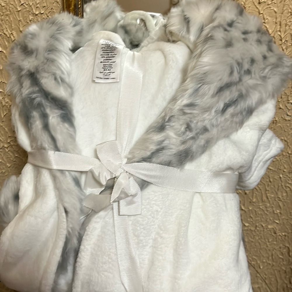 Robe is hooded with white and grey faux fur