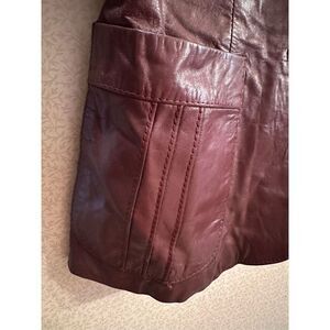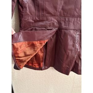 Red/Brown leather jacket. Circa 1970’s. Lined. Two pockets in the front. See pics for measurements on the bust and waist. Length is 25 inches.