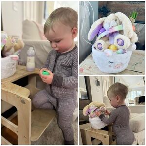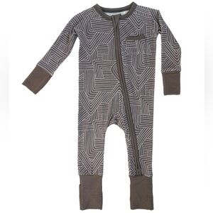 Brown onesie with a geometric design. Features a front dual zipper with a chest pocket. Foldover footies and mittens. EUC.