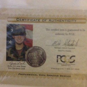Up for sale is a 1994-W Women in Military Silver Dollar - an American Heroes Edition - graded MS70 by PCGS and signed in the slab by Jessica Lynch. Jessica Lynch was a women soldier captured in Iraq in 2003 in the battle for Nasiriyah, when the vehicle she was riding in was hit by a rocket propelled grenade. She suffered numerous serious injury including a broken leg, arm and ankle. She was rescued 8 days later by US Special Forces thus becoming the first US women POW soldier ever rescued. This coin also comes with a COA by PCGS.