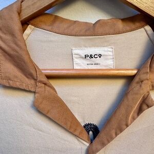 P&Co, P and Co, vintage inspired, retro bowling shirt, 70s aesthetic, y2k menswear, soft lyocell shirt, two tone button up, desert tones, coffee shop style, indie surf, relaxed fit, minimal streetwear, skater outfit, neutral aesthetic, vacation shirt, unisex, open collar, resort style, brown beige, beach club vibes, palm tree embroidery, laid back style