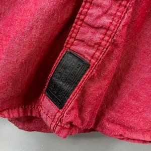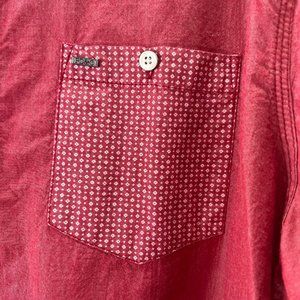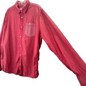 PD&C button up shirt in light chambray red. Diamond print on pocket, shoulders and upper back. Long sleeve, good condition. Size XL.