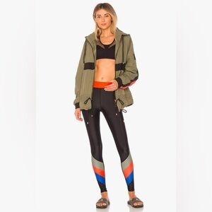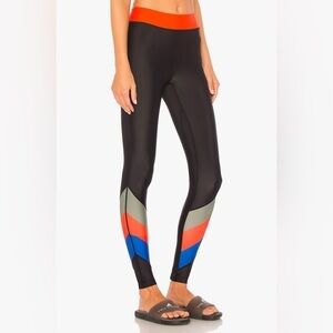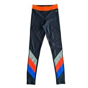 Full length active legging with a mid-rise waist and color blocked calves for a bold gym look. Crafted from high performance easy-care fabrication for additional support and comfort during high impact activites. Size Small and in excellent preowned condition; no visible flaws.