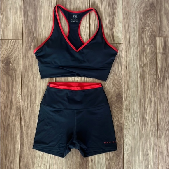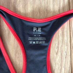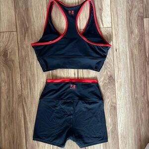 Australian owned fitness brand P.E. nation Vita Bike Short and Sports Bra Set in Marine Blue with Red detail.