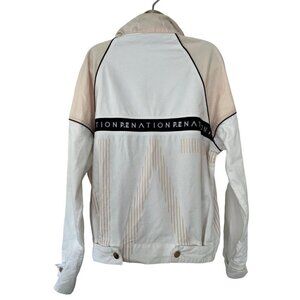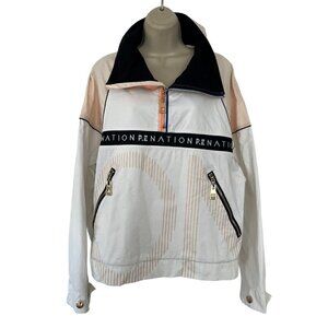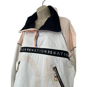 P.E Nation woman's half zip pullover jacket. Jacket is white with cream sleeves and stripes, a black collar, an orange and blue half zip front placket, and a spell out across the front in black with white writing. Jacket has two front zip pockets with gold zippers. It's made of 100% cotton and is a woman's oversize small. Org. list price $280.