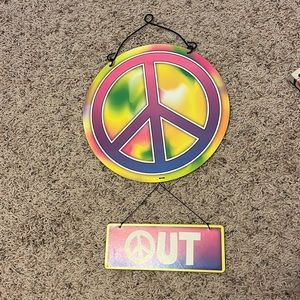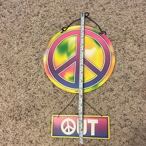Cute metal colorful sign, hanging part switches to ‘peace’ and ‘out’.