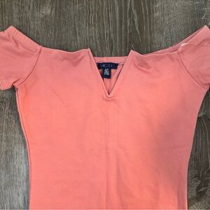 peach dress with v neck off the shoulder detail. brand is uk2la size small. some stains in the back, might be able to wash them out.